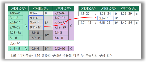 그런데 다른 두 복음서는 〈마가복음〉 1,40~3,19(3,7~12을 제외하면)을 받아들이고 있으면서도 이야기 구성에 있어서는 다르게 수용했다. 아래 표에서 보듯, 〈루가복음〉은 〈마가복음〉의 구성을 그대로 받아들인 반면, 〈마태복음〉은 하나의 묶음을 세 묶음으로 나누어 재배치했다.